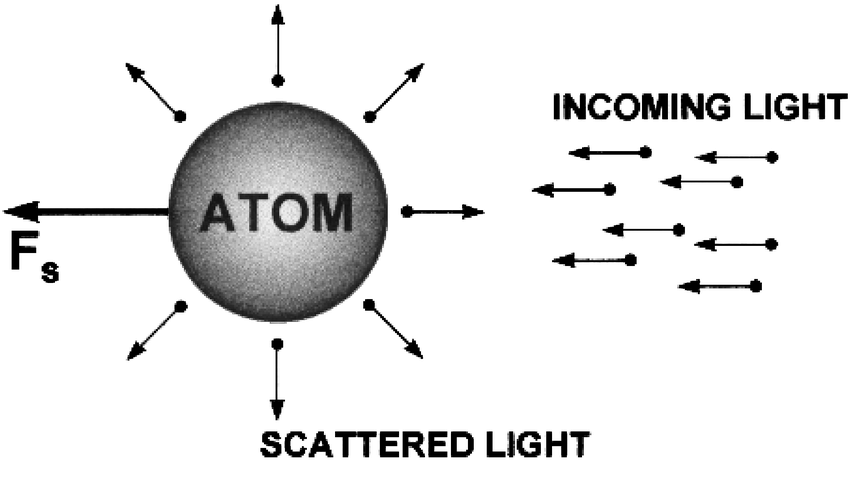원자가 $E=\hbar w, \vec{p}=\hbar \vec{k}$의 photon을 받으면$($이때 $w < w_{0}, \delta \approx 0$ $)$, photon의 방출을 무작위적인 방향으로 이루어진다. 따라서 원자가 받는 힘은 photon이 오는 방향이다. 따라서 서로 반대되는 방향의 빛을 조사하면 stable point를 만들 수 있고, 이를 3차원으로 확장하면 원자를 scattering force를 이용해 공간 상에 가두어 둘 수 있다. $w<w_{0}$이기 때문에, 흡수한 에너지보다 방출한 에너지가 조금씩 크게 된다. 이것이 계속해서 반복되다 보면, 원자는 냉각되게 된다. 이를 Doppler cooling이라고 한다.