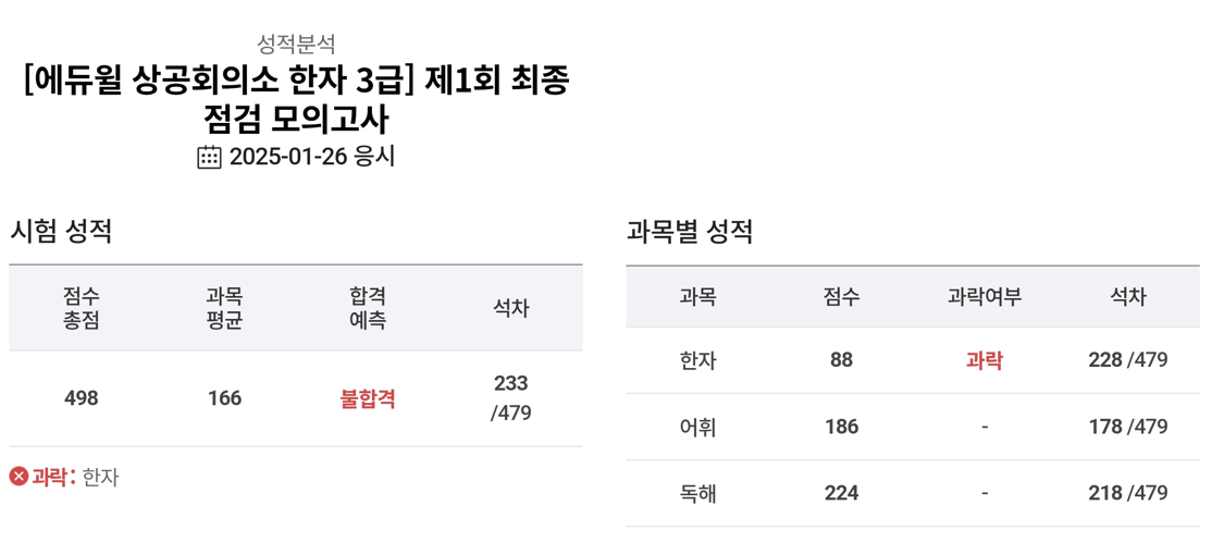 한자 공부 더 계속 해서 한자 부분 점수 올리고, 어휘랑 독해 부분도 준비 하나도 안하고 푼 거라 한자 실력 늘린 거 + 사자성어 좀 보는 등으로 공부 조금만 더 하면 3급 합격점까지는 금방 올라올 것 같다. 그래도 목표가 3급 따는게 아니라 일본어 실력 키우다가 자연스럽게 올라가는 거라, 조금 더 걸릴 지도? 계속 공부하다 보면 한자들 쭉쭉 외우겠지~~ 어렵겠지만 꾸준히 해보자~~ 확실한 건 JLPT N3는 모르겠지만, 한자 3급은 2025년 올해가 가기 전에 무조건 딸 수 있을 것 같다!ㅋㅋ