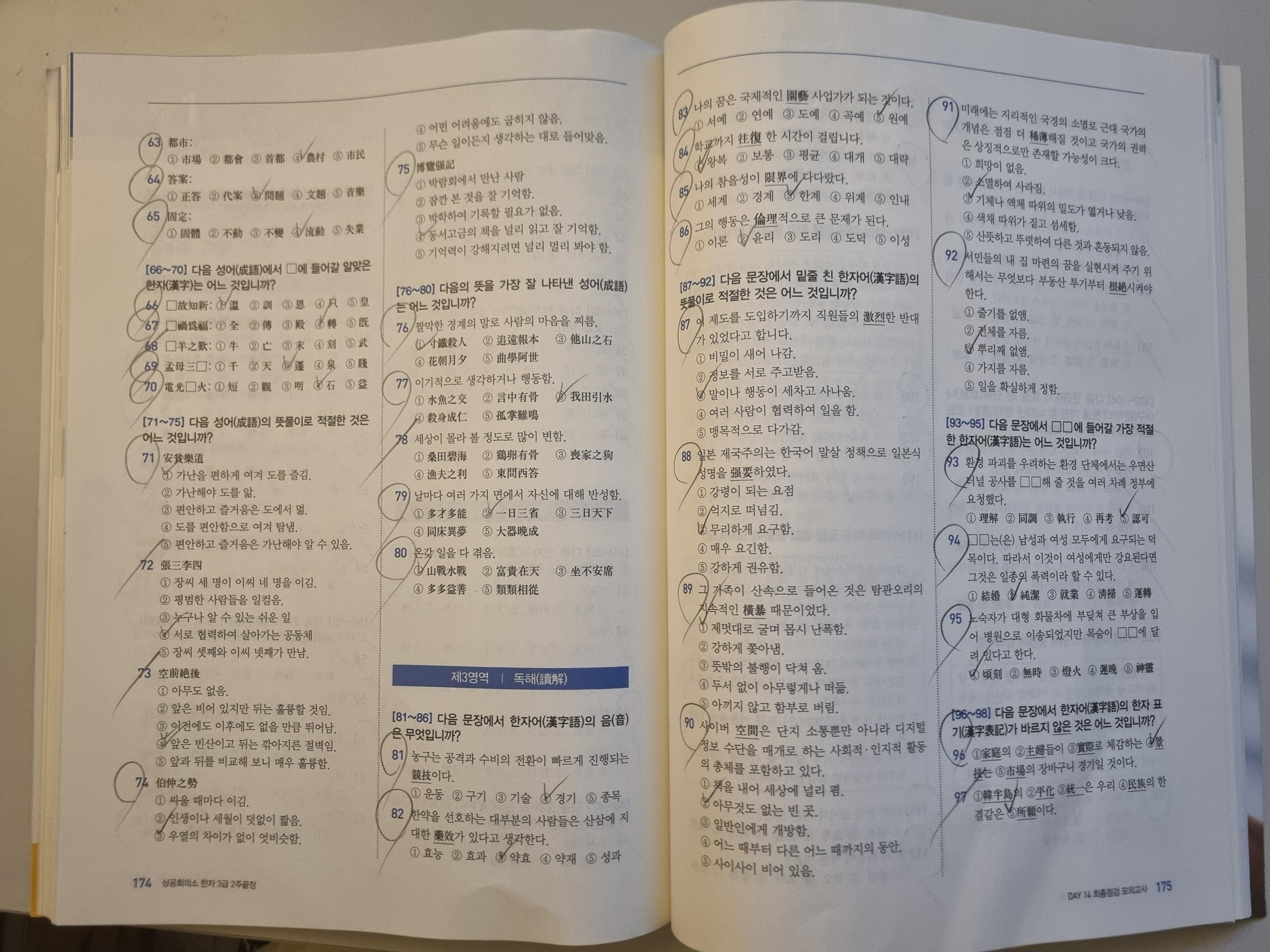 그러다가 예전에 한자 공부하던 책을 꺼내서 3급 내용을 좀 뒤적거려 봤는데 그래도 아는 한자가 꽤 보이더라? 그래서 한 번 모의고사 풀어봤다. 시험 시간은 60분인데 30분만에 다 풀었다.