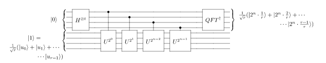 $$ \left| u_{0} \right\rangle = {1 \over \sqrt{r}} \underset{k=0}{\overset{r-1}{\sum}} \left| a^{k}\ (mod\ N) \right\rangle. $$