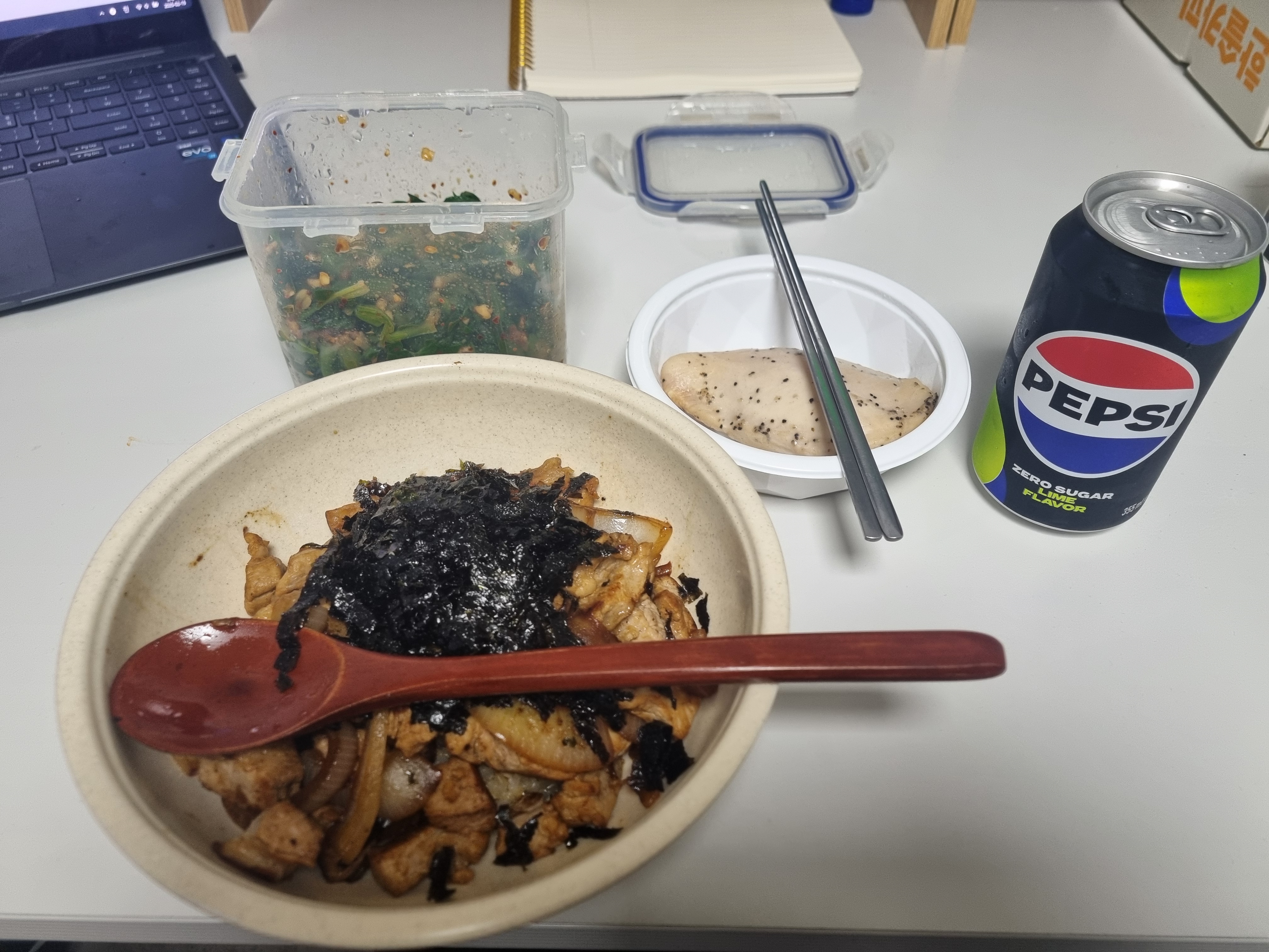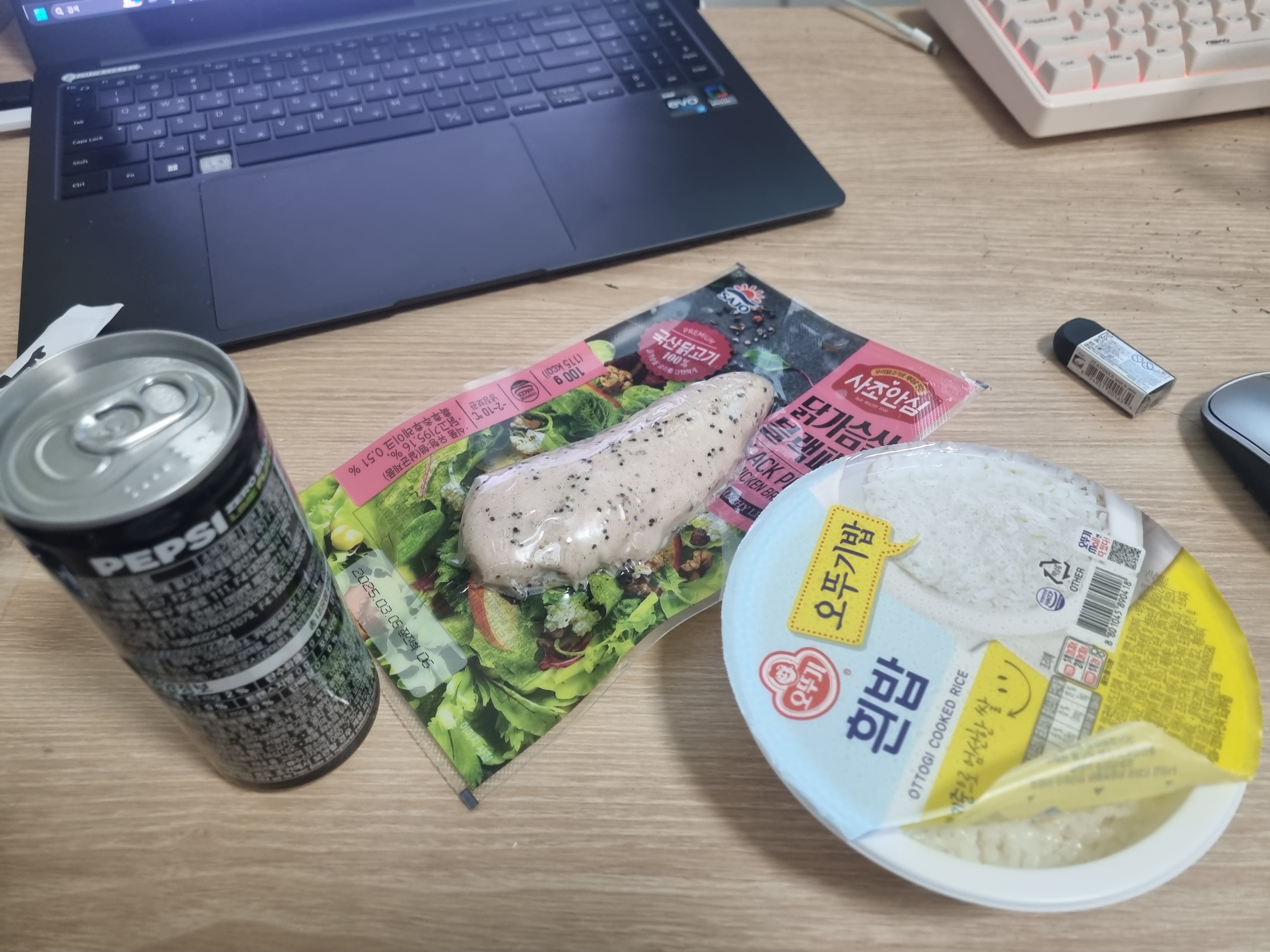 연구실에 있다가 배고파서 먹은 즉석에 즉석에 즉석 식품... 저렇게 먹었는데 왜 먹을만 한지 모르겠다ㅋㅋ 이걸 내가 다 먹을 수 있을 거라고, 전자레인지 돌리면서도 생각도 못했다. 저렇게 먹으니 뇌가 미쳐버린 건지, 닭가슴살에서 소시지 맛이 나네 하면서 맛있다 하면서 먹었다. 그 대신, 먹는 게 좀 퍽퍽하다 보니 물리기 쉬워서 콜라는 필수가 되어 버렸다. 그냥 일반식에서는 크게 상관 없는데, 저런 식단에서는 콜라 없이는 밥을 못 먹겠다. 뭐 요즘 제로콜라는 탄산 빼면 그냥 물이니까... 괜찮지 않을까 싶다. 그래도 장기적으로는 콜라도 식단에서 빼버리고, 우유나 두유 아니면 물로 대체할 생각은 갖고 있다.