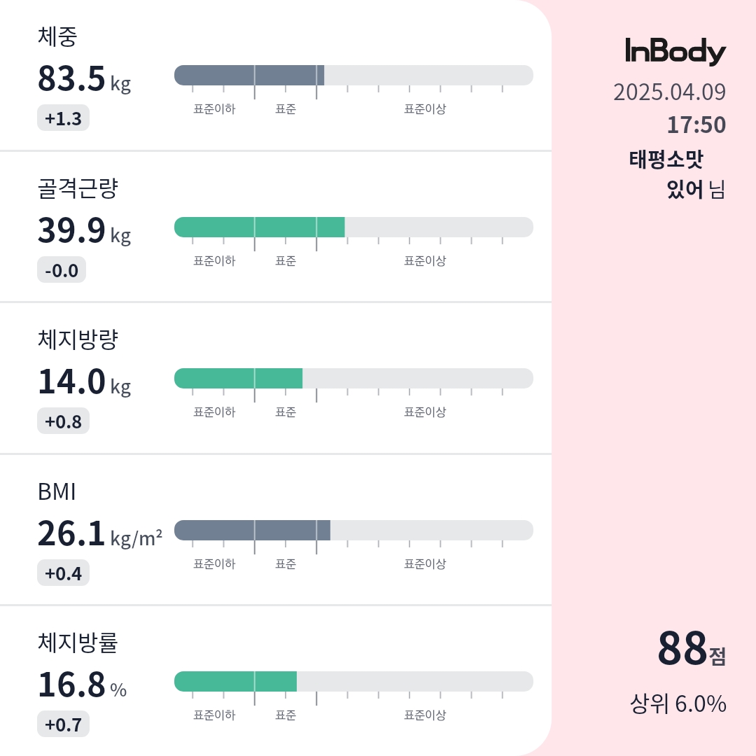 오늘 학교에서 인바디도 재어봤다. 아니 근데 나 인바디 상태 왜 이래?ㅋㅋㅋ 내 골격근 다 어디갔고, 체지방량은 왜 이렇게 많아ㅋㅋㅋ 벌크업한다고 너무 먹어댔나 싶네... 그런데 몸은 예전에 인바디 95점이었던 골격은 43kg 체지방률 10% 보다 훨씬 지금이 좋은 것 같은데...ㅋㅋ 왜 그럴까 싶다.