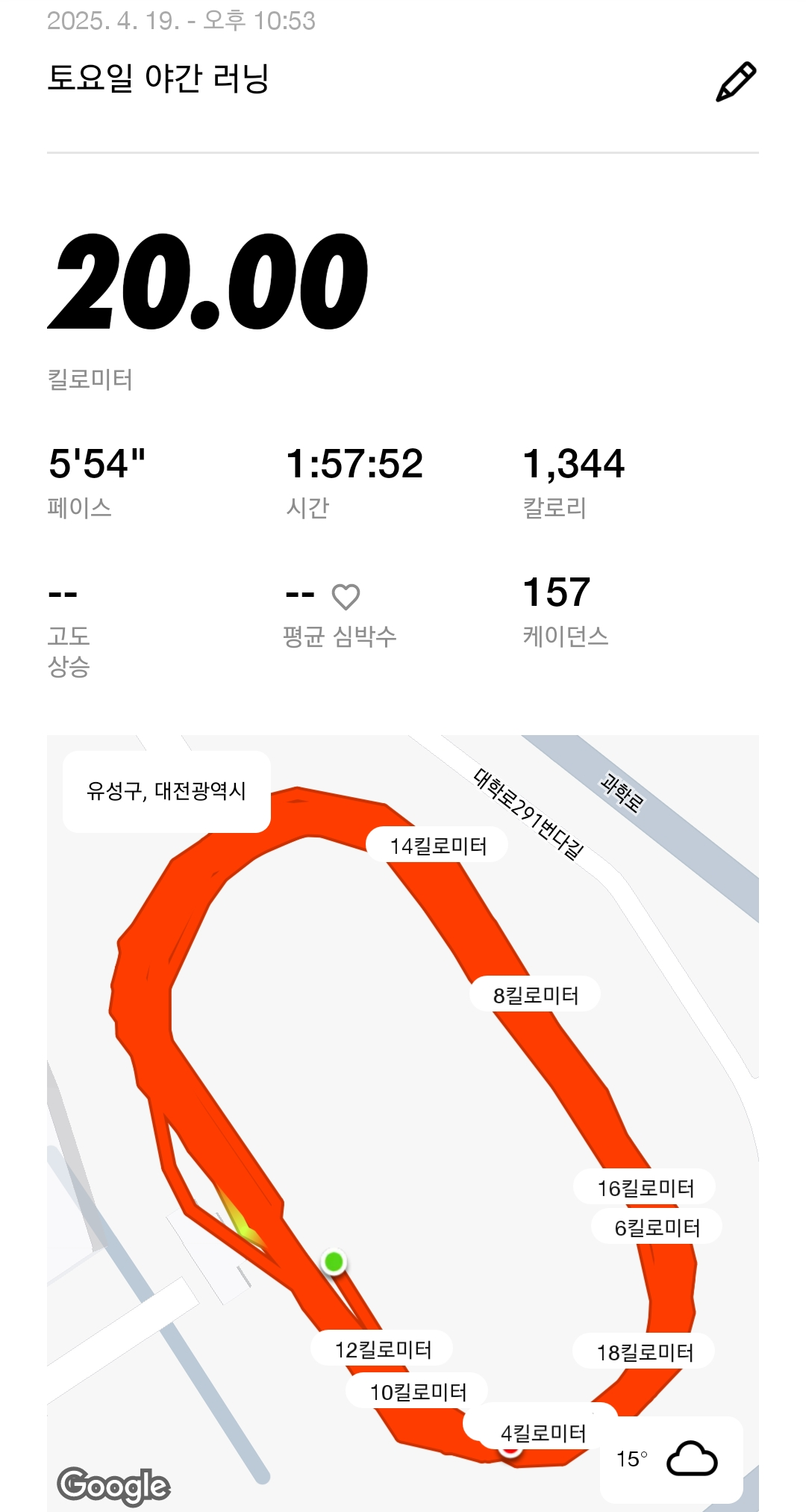 저번 러닝 15km에 이어서 이번에는 20km를 달려 보았다. 페이스로 보면 600 조금 아래로 전의 15km 때랑 비슷하다고 생각할 수 있지만, 전에는 3번 쉬었고 이번에는 2번 쉬었다. 그리고 거리도 늘었으니 일단 최소 2개는 는 걸로 볼 수 있겠다ㅋㅋ 그리고 오늘 비가 꽤 왔는데, 비를 맞으면서 뛴 디버프도 있으니 날씨 맑을 때 뛰면 더 좋아질 수 있을 듯 하다. 그런데 확실히 20km 뛰어 보니까 고통의 품질이 15km 때랑 다른 것 같기는 하다ㅋㅋ 끝나고 나니 하체가 그냥 다 아프다... 관절만 아픈 게 아니라 근육들이 더 아프다... 관절은 오히려 덜 아픈 것 같다ㅋㅋ 그리고 놀라운 점은 상체도 근육통이 온다는 것이다... 이건 내가 어제 등을 해서 그런 것일까 러닝에서 오는 통증일까... 잘 모르겠다ㅋㅋ